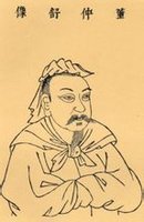 董仲舒(前179年-前104年) 西汉哲学家,今文经学大师,广川(今河北枣强)人。专治《春秋公羊传》。曾任博士、江都相和胶西王相,汉武帝举贤良文学之士,他对策建议“诸不在六艺之科、孔子之术者,皆绝其道,勿使并进。”为武帝所采纳,使儒学成为中国社会的正统思想,影响长达2000多年。其学以儒家宗法思想为中心,杂以阴阳五行说,把神权、君权、父权、夫权贯串在一起,形成帝制神学体系。从而他提出了天人感应、三纲五常等重要儒家理论。